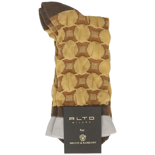Średniej długości skarpetki Agde i ich złoto kolor charakteryzują się prostym designem z geometrycznym wzorem, który zapewnia oryginalny akcent na stopach. Zaprojektowane i wyprodukowane przez Alto Milano dla Melvin & Hamilton, doskonałość włoskiej produkcji gwarantuje najwyższą jakość. Wykonane w 78% z wiskozy, te średniej długości skarpetki są cienkie i wygodne, a dzięki uniwersalnemu dopasowaniu będą służyć przez długi czas.