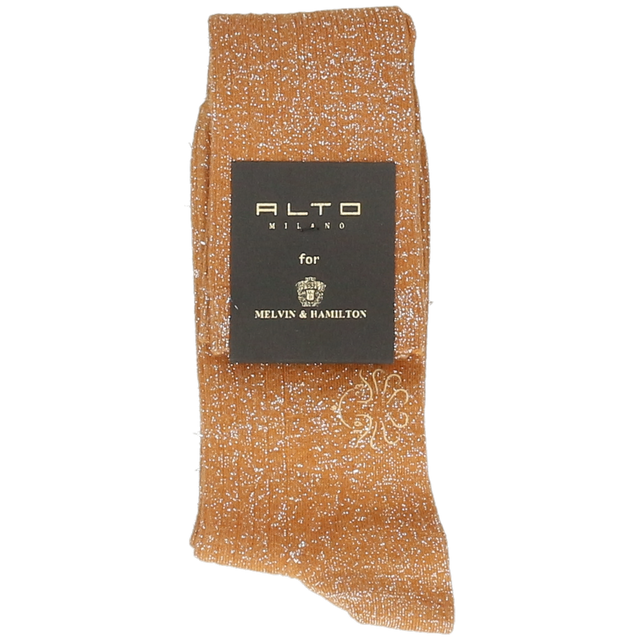 Długie skarpetki Menton i ich pomarańczowy kolor wyróżniają się wysokim krojem i wyjątkowym designem. Dzięki prążkowanemu i cekinowemu wykończeniu, model ten doda efektownego i kobiecego charakteru Twojej stylizacji. Zaprojektowane i wyprodukowane przez Alto Milano dla Melvin & Hamilton skarpetki Menton są wykonane w 80% z bawełny, dzięki czemu są wygodne i przyjemne w noszeniu na co dzień.