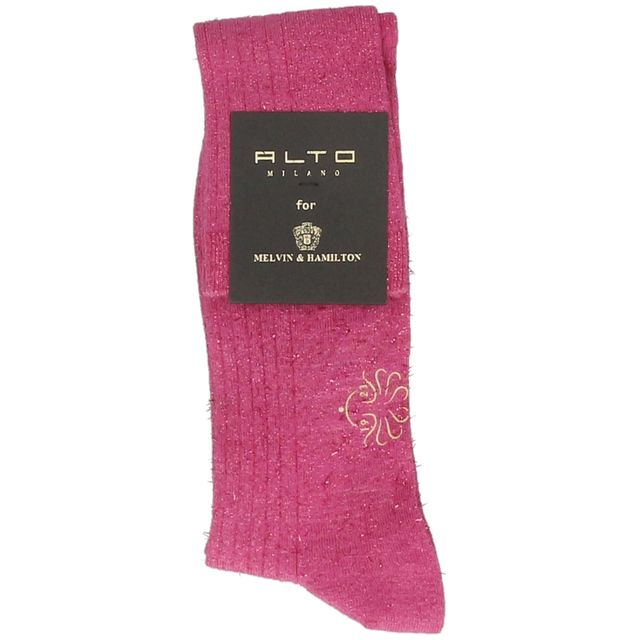 Długie skarpetki Menton i ich różowy kolor wyróżniają się wysokim krojem i wyjątkowym designem. Dzięki prążkowanemu i cekinowemu wykończeniu, model ten doda efektownego i kobiecego charakteru Twojej stylizacji. Zaprojektowane i wyprodukowane przez Alto Milano dla Melvin & Hamilton skarpetki Menton są wykonane w 80% z bawełny, dzięki czemu są wygodne i przyjemne w noszeniu na co dzień.
